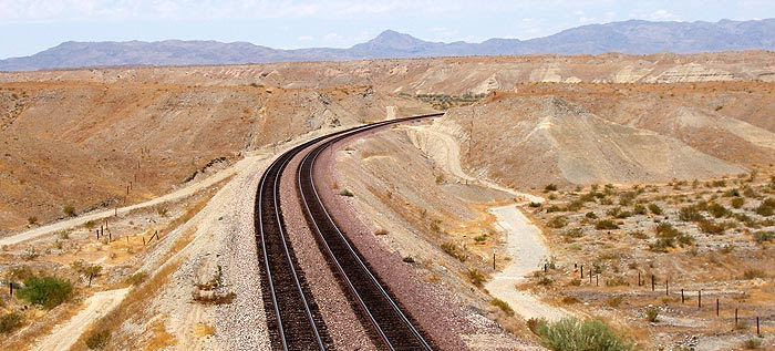 After crossing the Colorado River on August 3, we began our Rt66 California adventure. The previous four days of this trip had been spent primarily on Interstate 40 with some stretches of Rt66 thrown in, but from now on it was to be 66 all the way to the Pacific coast. On our way from the Colorado River to Needles, we passed over this neat double mainline; it'd be great to catch a train photo here.