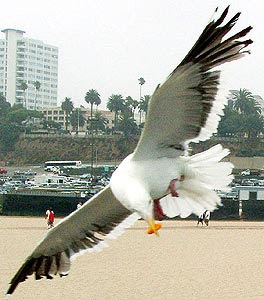On the beach, just north of the pier, is "Walk on LA", a 1988 "art tool" designed by Carl Cheng. When pulled by a tractor, it leaves the imprint of a city in the sand.