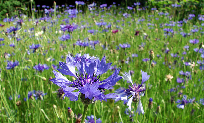 There is a wildflower garden near me, one I quite enjoy this time of year. Its chief bounty is a thick stand of Bachelor's Button, also called the Cornflower (Centaurea cyanus).