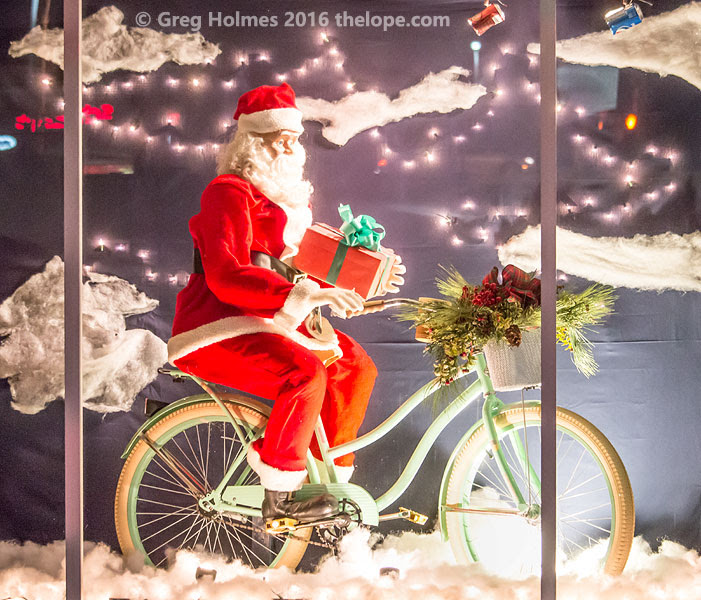 Higdon Florist, 201 East 32nd, often has nice window displays. The year, Santa rides a vintage bicycle.